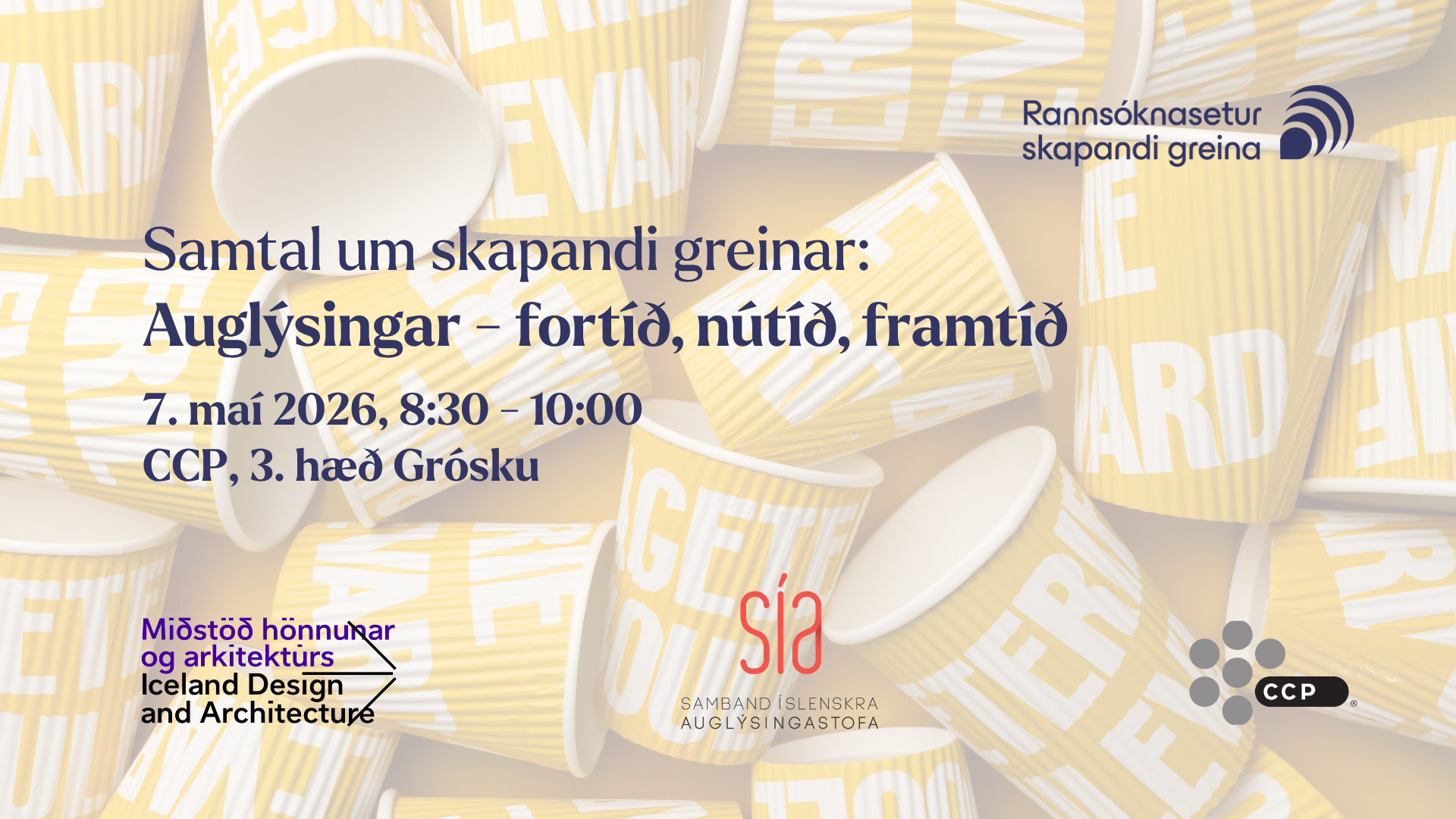 Rannsóknasetur skapandi greina (RSSG), í samstarfi við Samtök íslenskra auglýsingastofa (SÍA), Miðstöð hönnunar og arkitektúrs og CCP, býður í samtal um skapandi greinar fimmtudaginn 7. maí klukkan 8:30 –10:00 í húsakynnum CCP Í Grósku, 3. hæð, að Bjargargötu 1, 102 Reykjavík. Viðburðurinn er á dagskrá HönnunarMars 2026 og erindin verða einnig í beinu streymi.