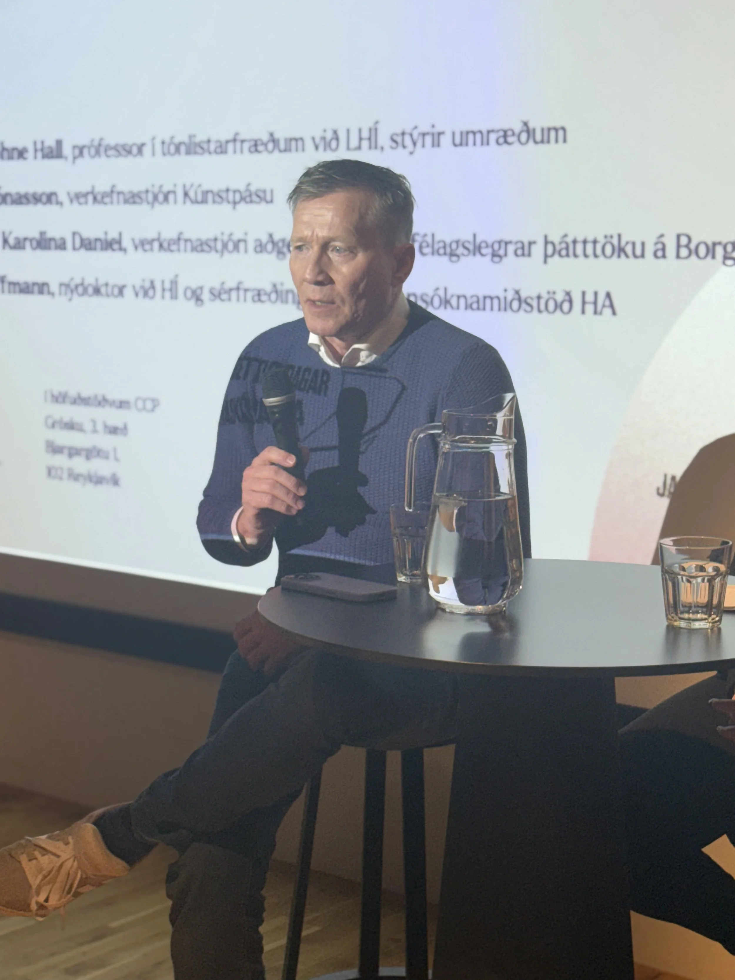 Í kjölfarið sagði Hlynur Hallsson frá sinni reynslu sinni en Hlynur er myndlistarmaður sem býr og starfar á Akureyri og í Berlín. Hann starfaði einnig sem safnstjóri Listasafnsins á Akureyri 2014-2024 og auk myndlistarinnar sinnir hann kennslu. Erindi Hlyns einkenndist af bjartsýni og lausnamiðuðum hugmyndum, en þó án þess að draga úr stærðargráðu þeirra áskorana sem myndlistarmenn standa frammi fyrir.